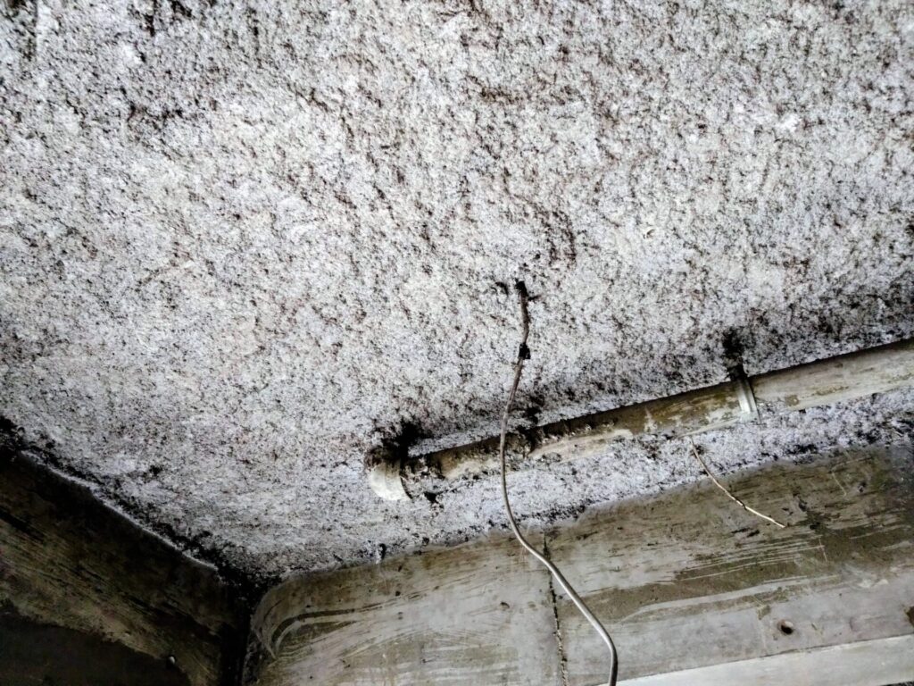 今回の現場では、写真のように天井に吹付け材が確認され、