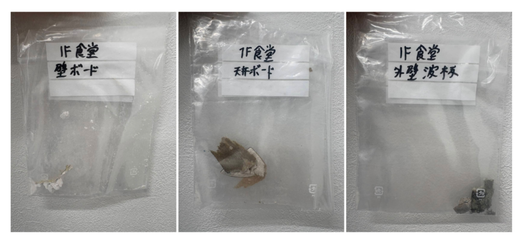今回の写真は、建物内の食堂部分から採取された壁・天井材の一部です。